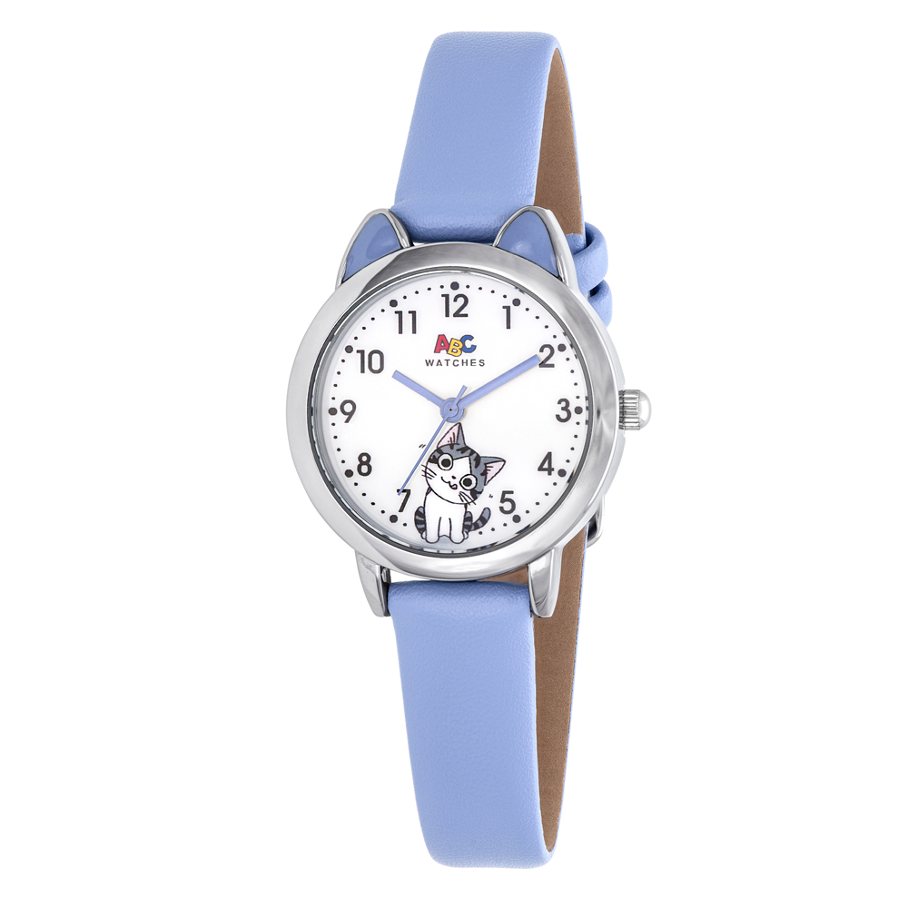Suloinen ABC-rannekello hurmaa kissanystävät! Vaaleansinisessä kellotaulussa on herttainen kissan kuva ja korvat, jotka luovat leikkisän ilmeen. Kellossa on selkeät mustat numerot ja sininen keinonahkaranneke lisää kellon mukavuutta. Tämä lasten kello on loistava valinta ensikelloksi.
