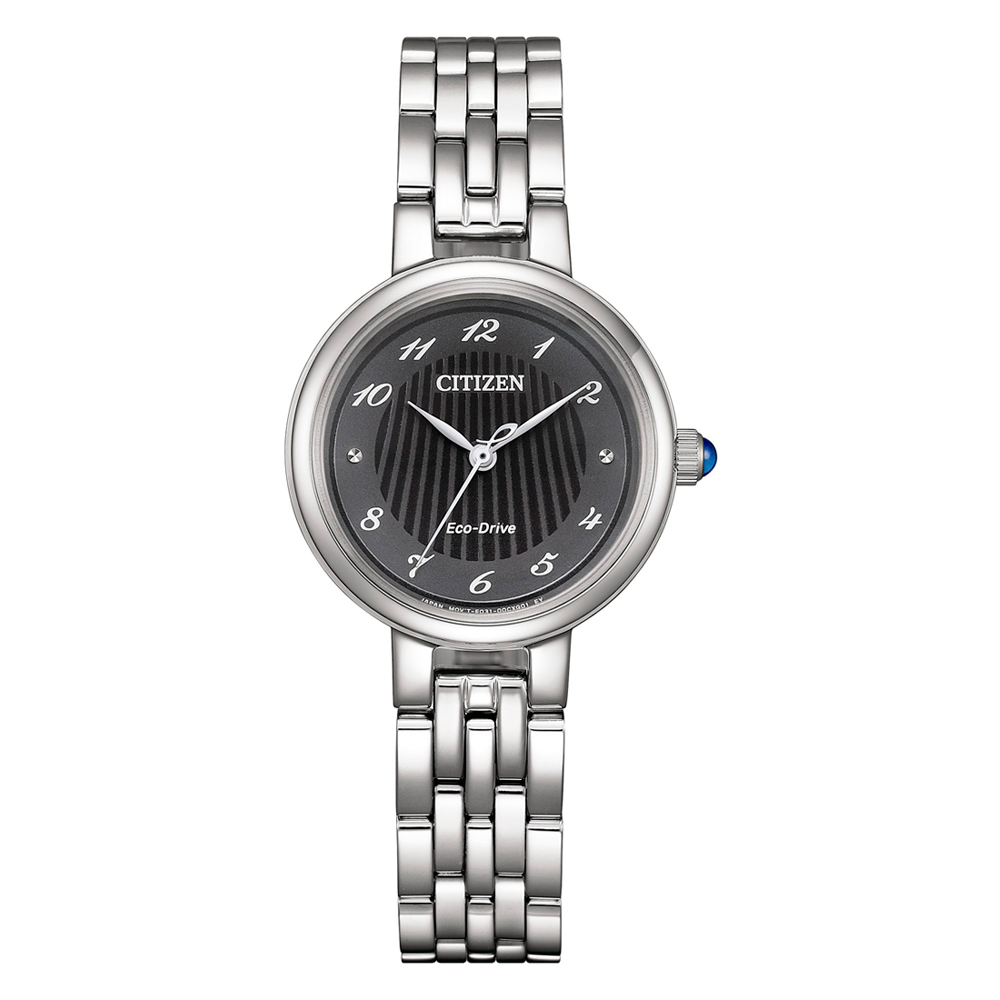 Ajaton Citizen Eco-Drive -naisten rannekellossa on musta taulu, kestävä safiirilasi ja teräsranneke. Vedenkestävyys 5 ATM. Kello saa virtansa valosta, ja täyteen ladattuna akun varaus kestää jopa 180 päivää. Kuoren halkaisija 28,0 mm.