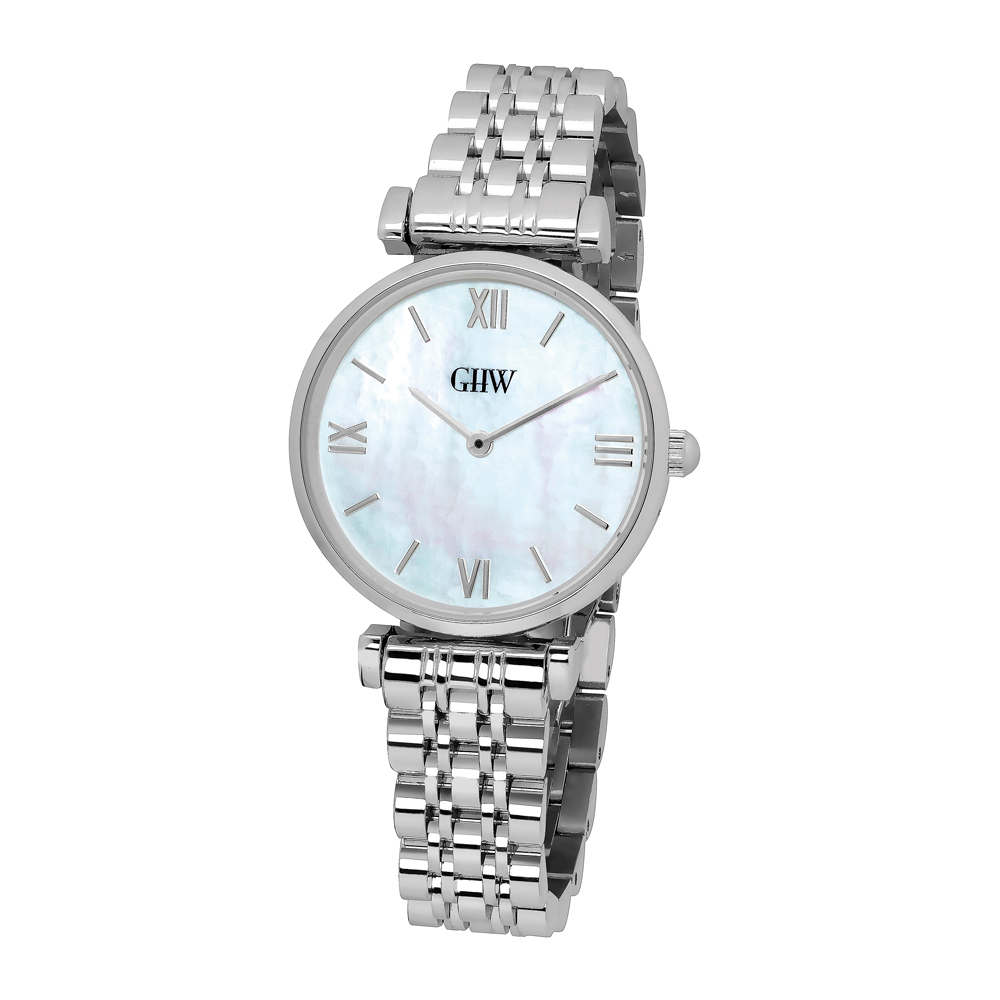 Tyylikäs 32 mm GHW rannekello naisille. Teräksenvärinen runko ja kaunis helmiäistaulu yhdistettynä roomalaisiin numeroihin luovat ajattoman ilmeen. Kellossa Miyota-koneisto, mineraalilasi ja 3ATM vedenkestävyys. Täydellinen yhdistelmä kauneutta ja arjen käytännöllisyyttä.
