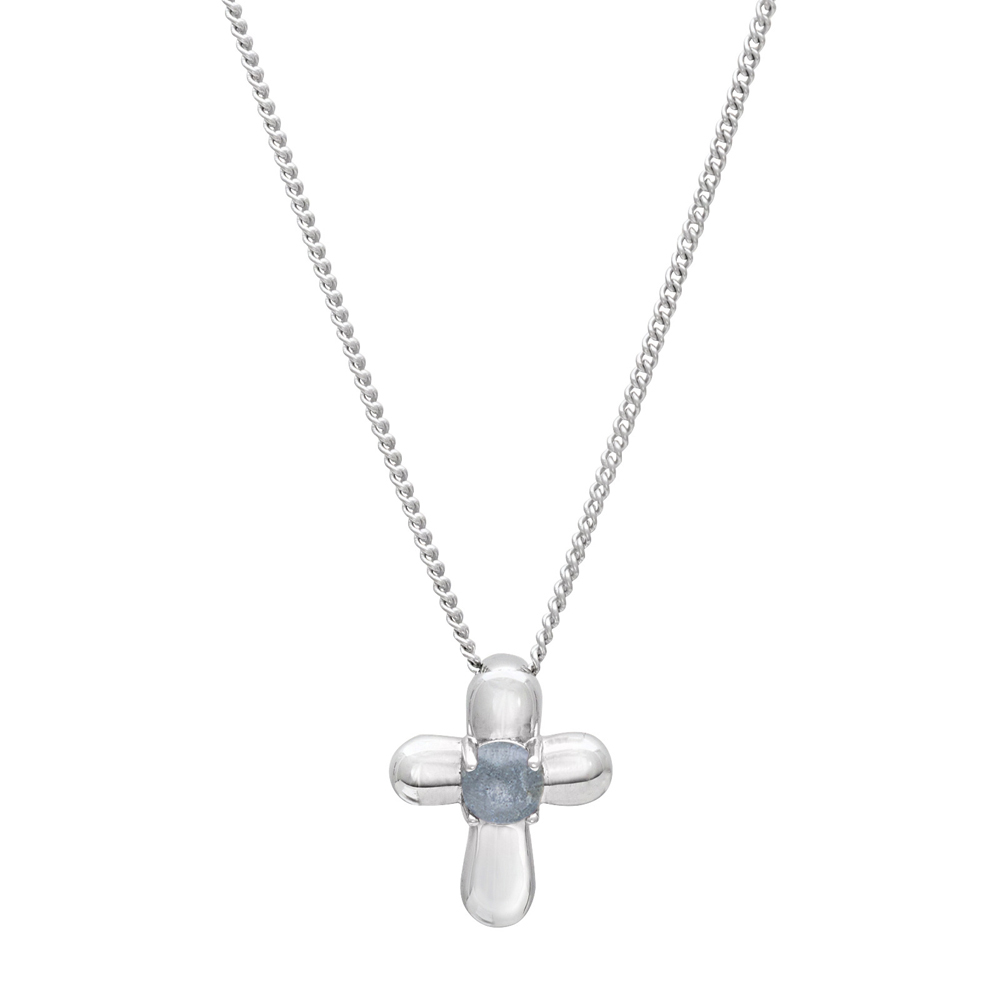 Ihastuttavan siro kasteristi on valmistettu rodinoidusta hopeasta. Pienen ristin keskellä säihkyy herkkä vaaleansininen lasikristalli. Ristin mukana tulee ohut panssariketju, jonka säädettävä pituus on 35 + 3 cm – täydellinen koko lapselle. Kaunis ja merkityksellinen lahja kastepäivään tai muuhun tärkeään hetkeen.