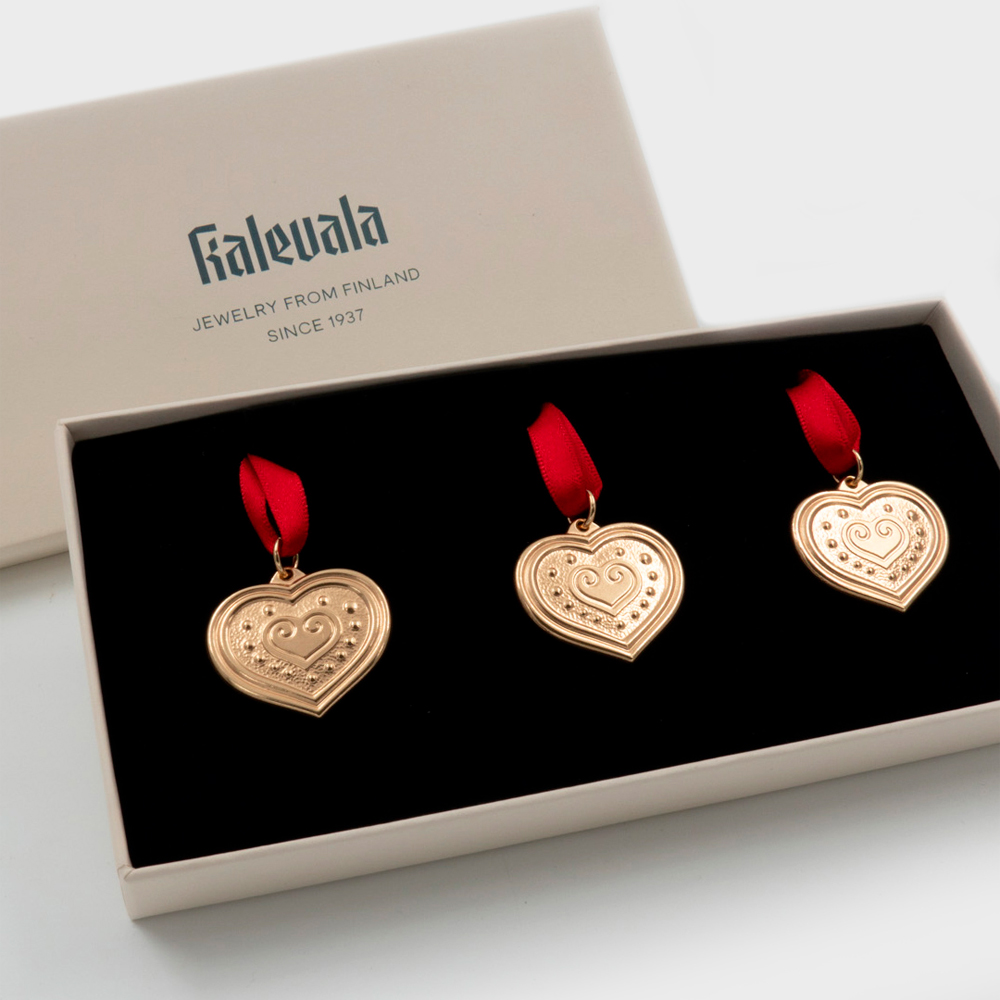 Rakastettu Euran sydän nyt kauniina kolmen koristeen lahjasettinä. Koristeet on valmistettu kierrätetystä kullanhohtoisesta pronssista, ja niiden punaiset nauhat on tehty kierrätetyistä PET-pulloista. Esikuvana toimii viikinkiaikainen löytö Euran Pappilanmäestä. Ajaton ja ekologinen lahja jouluksi 2025.
