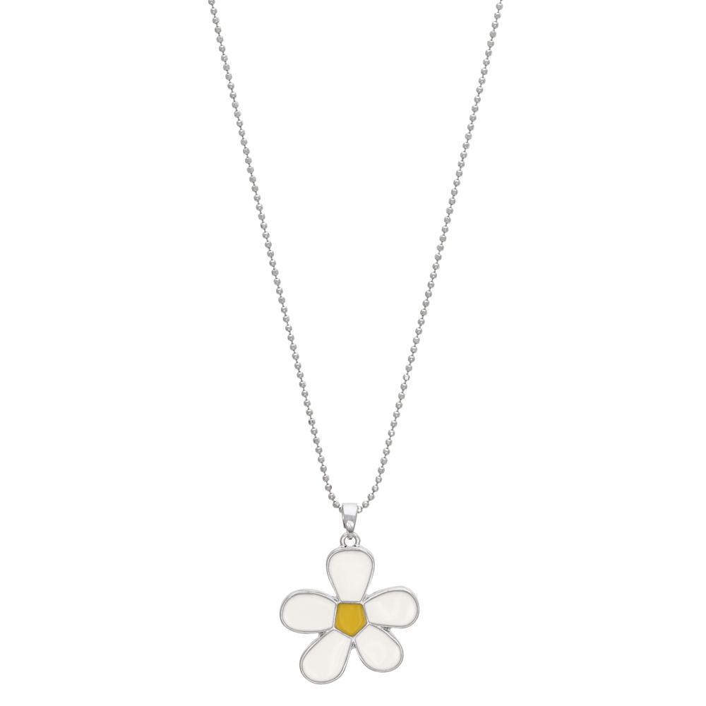 Suloinen kaulakoru hurmaa kukkadesignillaan. Valkoinen kukka keltaisella keskustalla tuo koruun iloisen ilmeen. Hopeanvärinen ketju on säädettävä (38 + 5 cm), joten pituus on helppo mukauttaa sopivaksi. Kevyt ja kaunis malli sopii erinomaisesti myös lapselle.