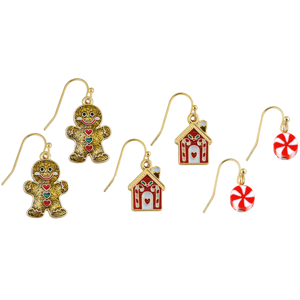 Ihastuttava jouluteemainen korvakorusetti, jossa kolme kullanväristä paria: polkakarkit, piparkakkutalo ja piparkakku-ukot. Kaikissa koukkukiinnitys. Hauska valinta pikkujouluihin tai joulun ajan asusteisiin!