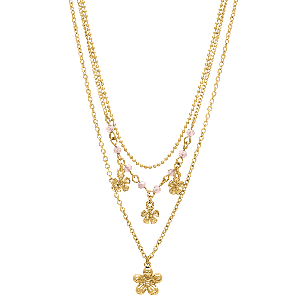 Kullanvärinen kaulakoru, jossa kolme erilaista ketjua kerrostuvat kauniisti. Korua koristavat kukkariipukset ja vaaleanpunaiset korukivet. Säädettävä pituus 42 + 5 cm takaa hyvän istuvuuden. Täydellinen valinta viimeistelemään naisellinen tyyli.
