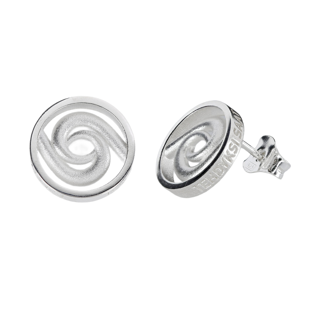 Lupaus Mitä voimallasi tehdyksi saat – korvakorut. Tyylikkäät 12 mm tappikorvakorut kierrätetystä hopeasta. Yhteistyössä Lotta Svärd -säätiön kanssa luotu korusarja kunnioittaa lottien perintöä ja kantaa mukanaan Fanni Luukkosen sanoja: “mitä voimallasi tehdyksi saat”.