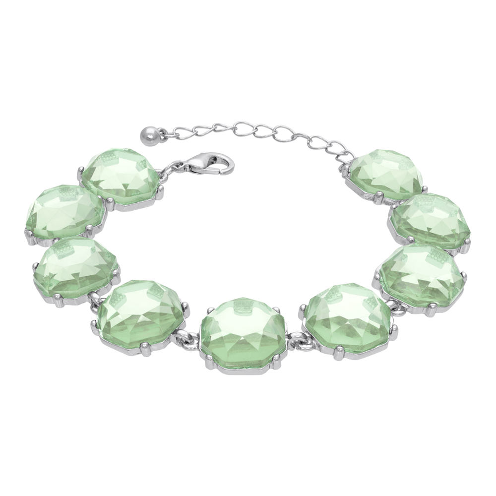 Näyttävä hopeanvärinen rannekoru, jota koristavat kirkkaan vihreät kristallit. Säädettävä pituus (17 + 5 cm) takaa miellyttävän istuvuuden eri ranteisiin. Täydellinen valinta tuomaan väriä ja säihkettä asuusi. Yhteensopivat korvakorut saatavilla.