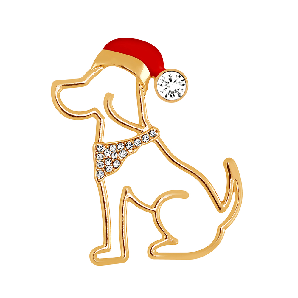 Iloinen koira-aiheinen rintakoru, jossa koiralla on punainen tonttulakki. Kullanvärinen pinta ja huolelliset yksityiskohdat tekevät korusta ihastuttavan lisä joulun asusteisiin tai lahjaksi eläinystävälle.