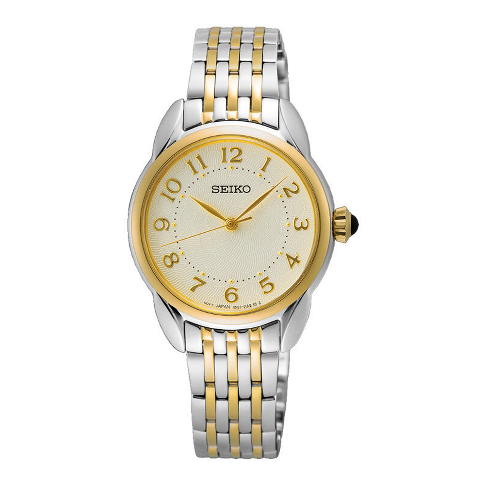 Seiko SUR562P1 on ajaton naisten rannekello. Kvartsikoneisto takaa tarkan ajanoton, ja vaalea kellotaulu kullanvärisin yksityiskohtineen tuo kelloon raikkaan ilmeen. Nuppia koristava musta kivi viimeistelee kokonaisuuden. Kestävä Hardlex-lasi ja teräskuori tekevät kellosta luotettavan arkeen. Kompaktin 28,7 mm halkaisijan ansiosta se istuu kauniisti ranteeseen, ja 5 ATM vesitiiviys tuo huolettomuutta päivittäiseen käyttöön.