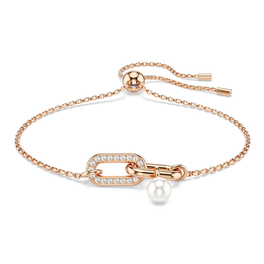 Elegantti ruusukullanvärinen Swarovski Consella -rannekoru. Tässä rannekorussa on kaksi toisiinsa kiinnittyvää lenkkiä, joista toinen on koristeltu kirkkailla kristalleilla. Toisesta lenkistä roikkuu kaunis helmi. Korussa on säädettävä liukulukko, joka takaa täydellisen istuvuuden. Yhdistä rannekoru saman sarjan kaulakoruun ja luo kaunis kokonaisuus.