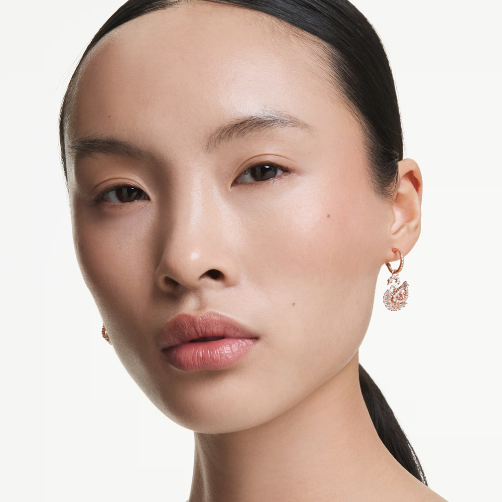 Anna Swarovskin ikonisen joutsenen liikkeen säihkyä näissä tunnistettavissa korvakoruissa. Siroon renkaaseen kiinnitetyt joutsenet ovat koristeltu kimaltavilla kristalleilla ja joutsenen siluetit ovat ruusukultapinnoitetut. Korun keskellä on vaaleanpunainen kristalli viimeistelemässä kokonaisuuden.
