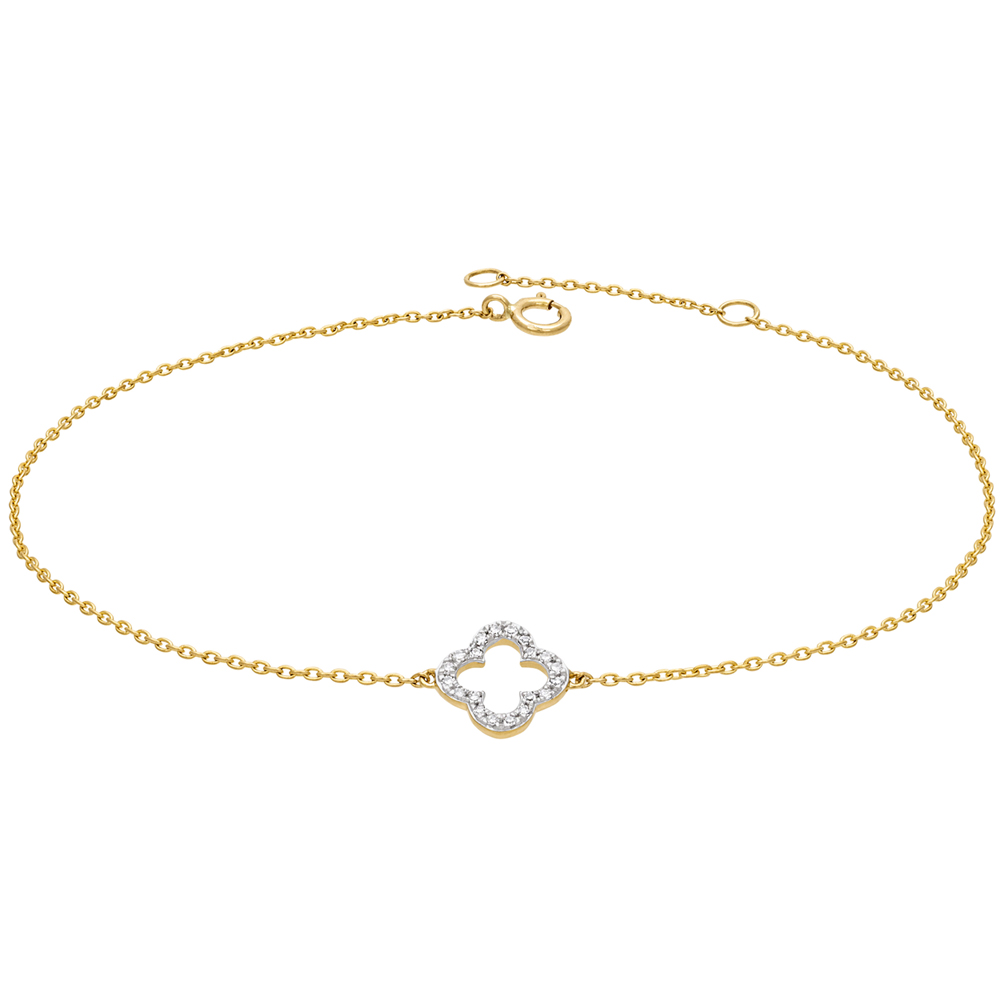 Siro timanttirannekoru, jossa keskellä kimmeltää kaunis neliapila yhteensä 20 W/P-laatuisella timantilla. Rannekoru on valmistettu 14K keltakullasta ja sen pituus on 17 cm + 2 cm säädettävä ketju, joten se istuu eri ranteisiin. Tämä apilarannekoru on täydellinen lahja tai lisä omaan korukokoelmaan.