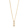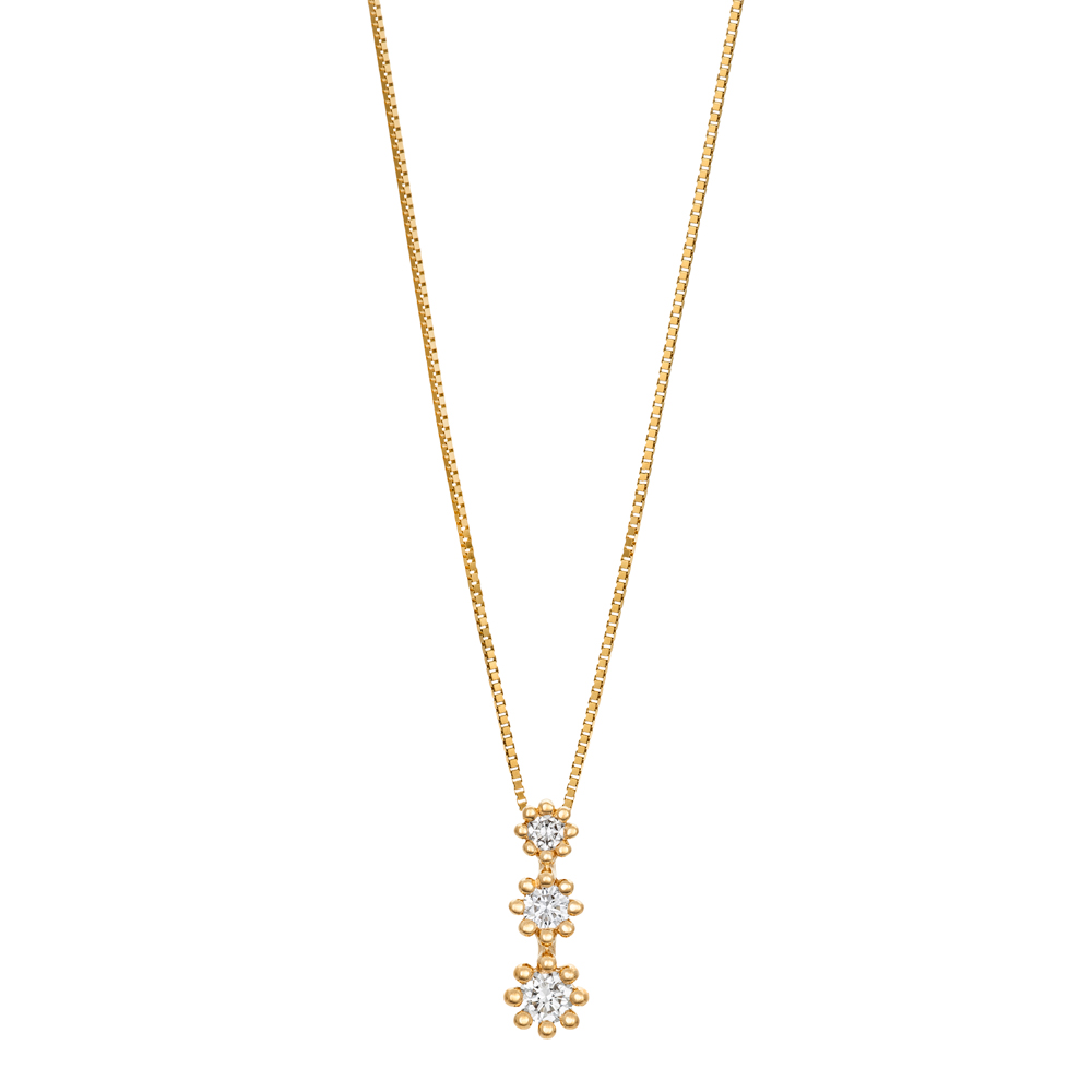 Tyylikäs keltakultainen timanttiriipus. Tässä riipuksessa roikkuu kolme säihkyvää timanttia, joiden yhteiskaraattipaino on 0,18ct. Yhdistämällä riipuksen yhteensopiviin korvakoruihin ja sormukseen, luot näyttävän kokonaisuuden.