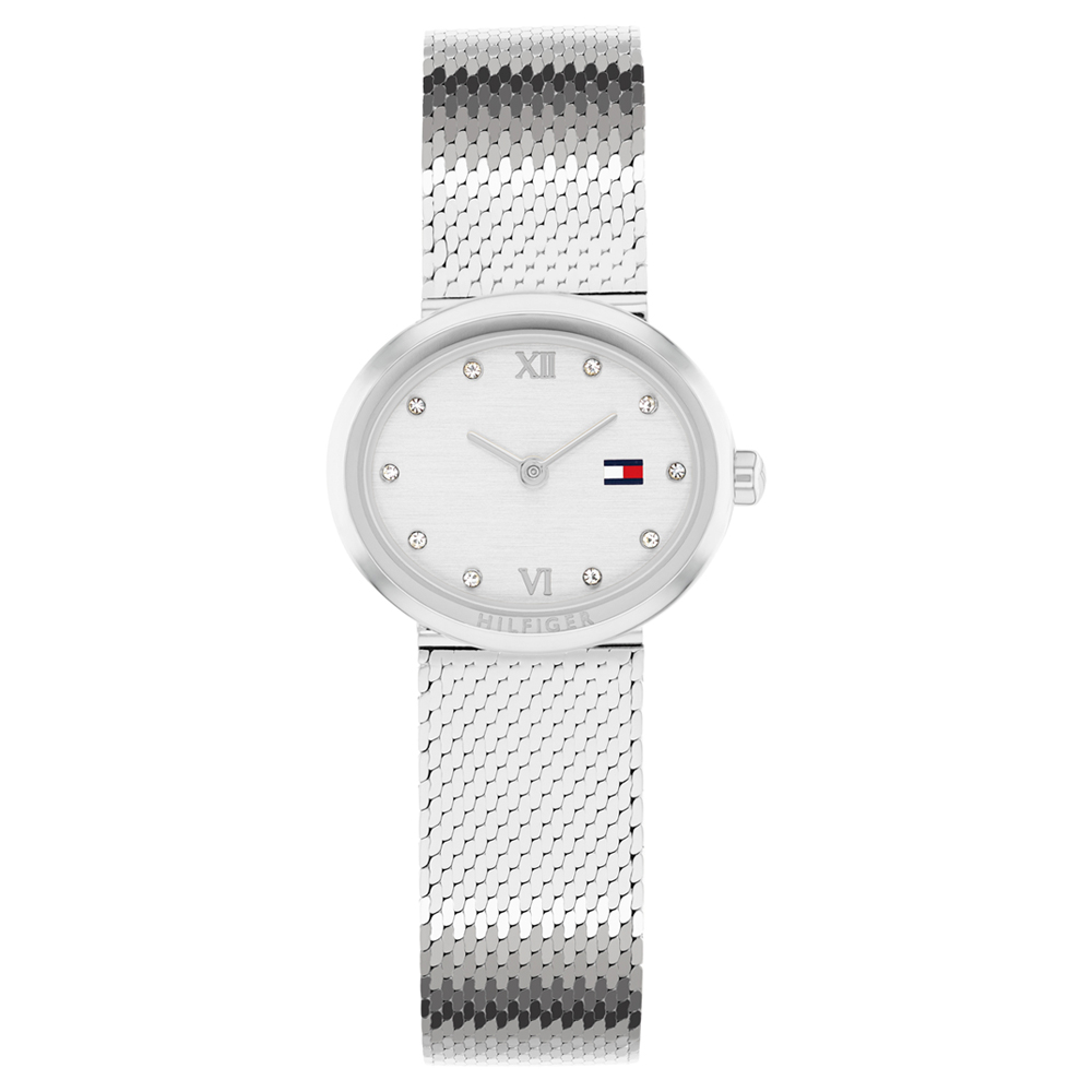 Ajaton Tommy Hilfiger Moira hurmaa hillityllä designillaan. Kellossa on ruostumattomasta teräksestä valmistettu kuori, hopeanvärinen kellotaulu ja hieno mesh-ranneke. 3 ATM vedenpitävyys suojaa kelloa roiskeilta, ja tekee siitä täydellisen valinnan jokaiseen päivään.